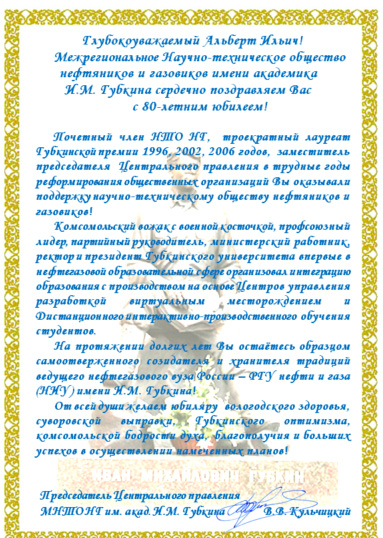 03.07.2019 Председатель Центрального правления Межрегионального НТО нефтяников и газовиков им. акад. И.М. Губкина поздравил с юбилеем Владимирова Альберта Ильича, президента РГУ нефти и газа (НИУ) имени И.М. Губкина, профессора, председателя Учебно-методического объединения вузов России, осуществляющих подготовку инженерных и научно-педагогических кадров для нефтегазовой отрасли (1993-2008); председателя специализированного совета по защите диссертаций (1998-2007); зам. председателя Российского национального комитета по мировым нефтяным конгрессам (1996-2010); зам. председателя НТО им. И.М. Губкина (2002-2011), лауреата Губкинских премий.